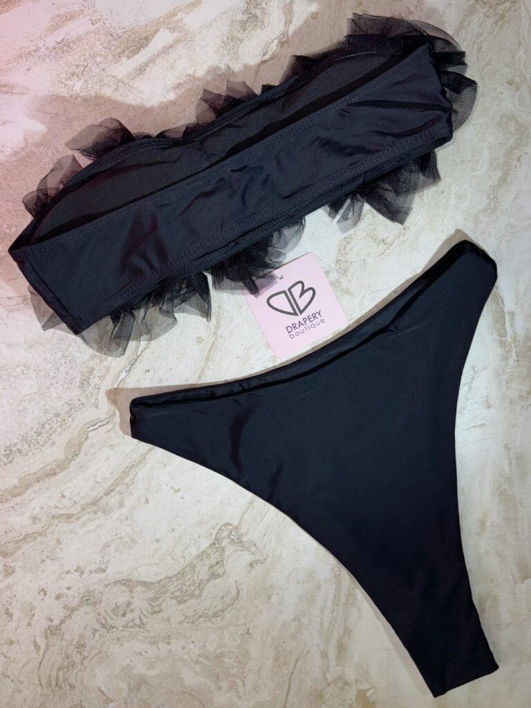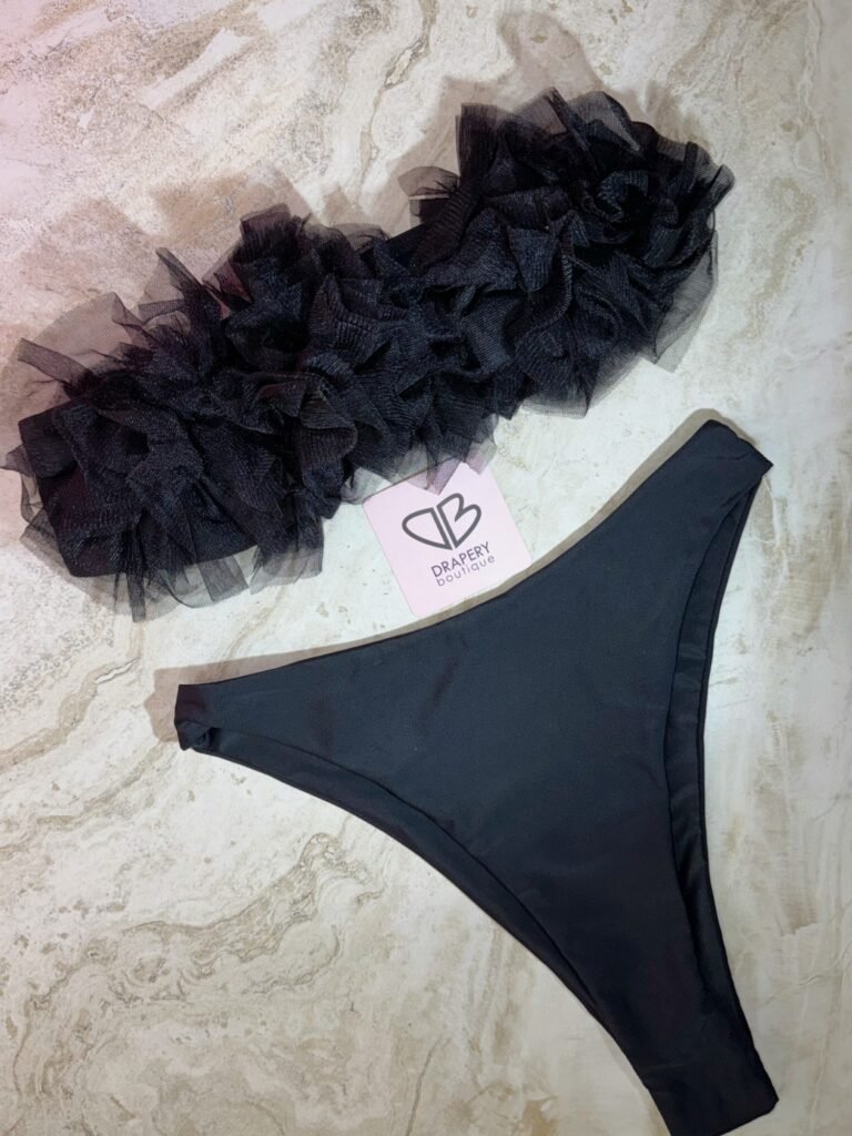 This stunning black bandeau bikini is a sophisticated addition to your swimwear wardrobe. The top boasts a voluminous, layered ruffle design, crafted from soft and breathable mesh fabric, offering a touch of elegance and flair. The bandeau style is strapless, ensuring a smooth silhouette, while the secure fit keeps it comfortably in place.