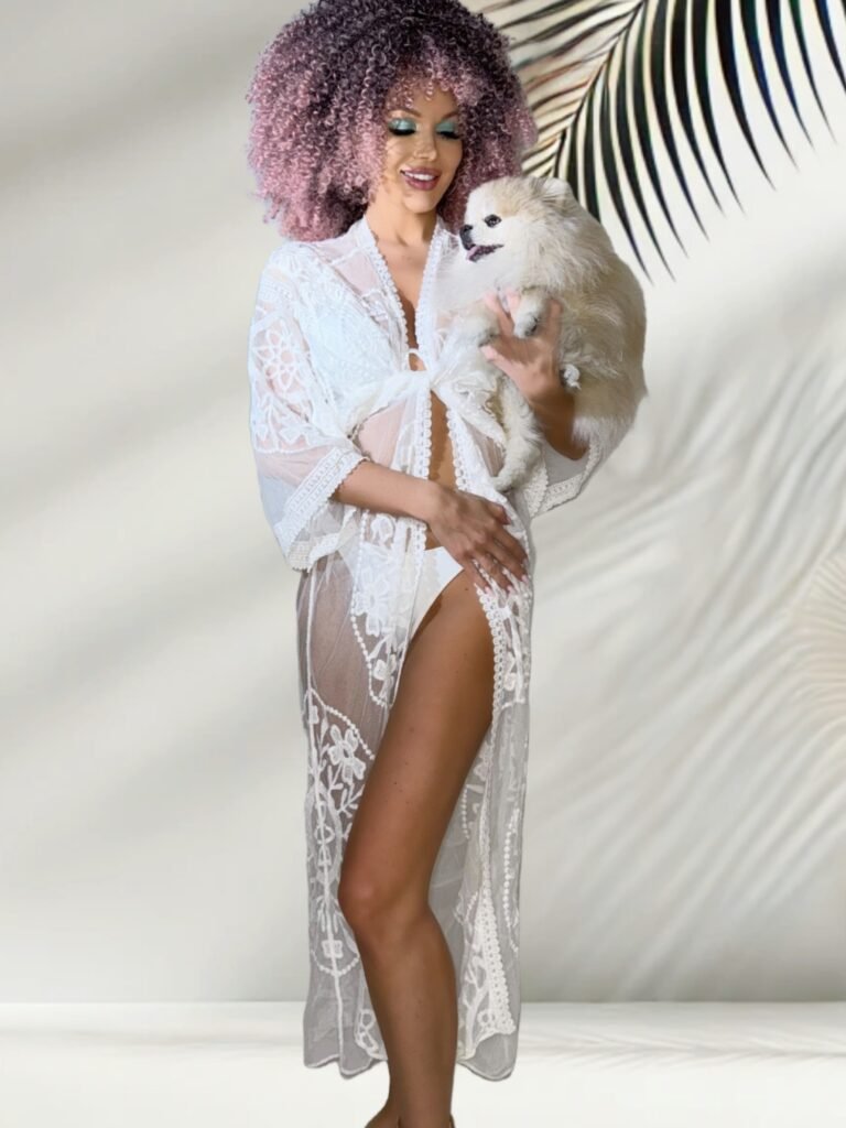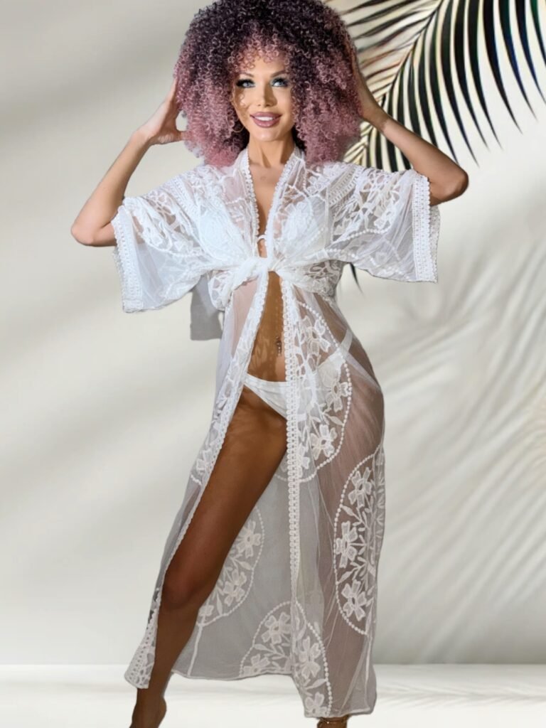 Step into summer sophistication with this stunning white lace beach dress. Crafted from lightweight, sheer lace, the dress is adorned with delicate floral embroidery that exudes femininity and charm. The kimono-inspired silhouette, complete with wide three-quarter sleeves and a front tie closure, adds a touch of elegance while allowing for easy layering over swimwear. Perfect for beach days, poolside lounging, or tropical getaways, this versatile cover-up combines comfort with style. The soft white color enhances your sun-kissed glow, making it a must-have addition to your summer wardrobe.