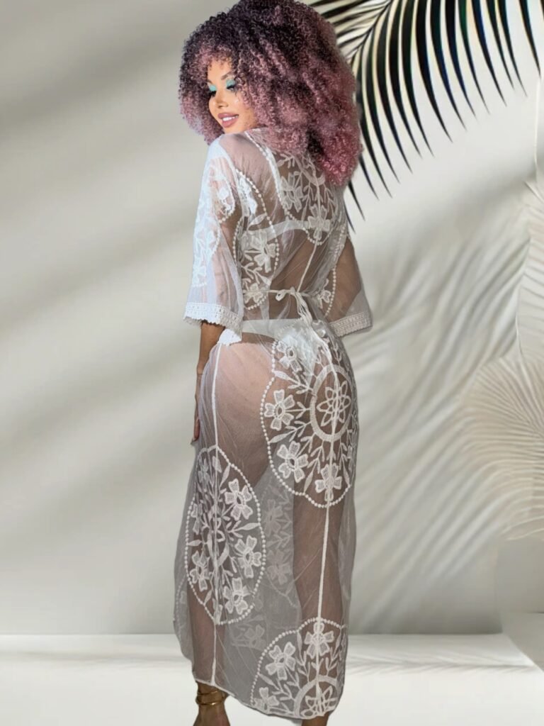 Elevate your beach look with this sheer white lace beach dress, featuring intricate floral embroidery and a breezy kimono-style design for effortless elegance.