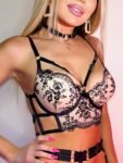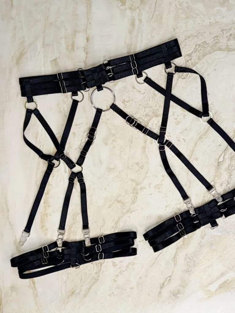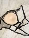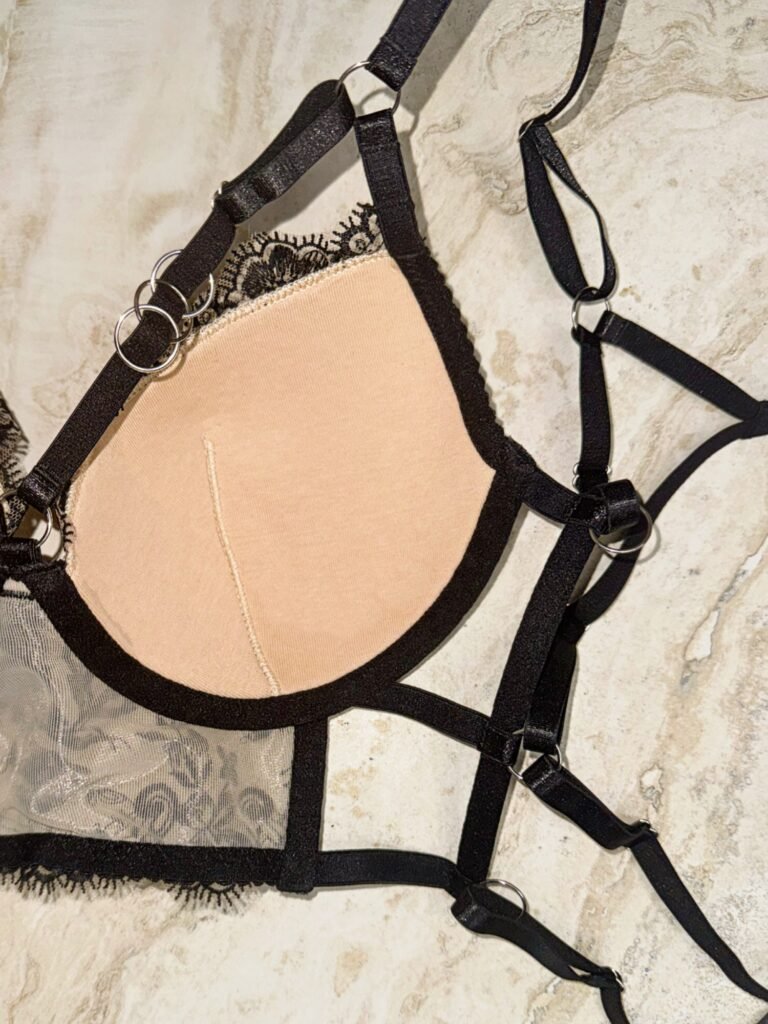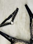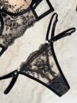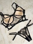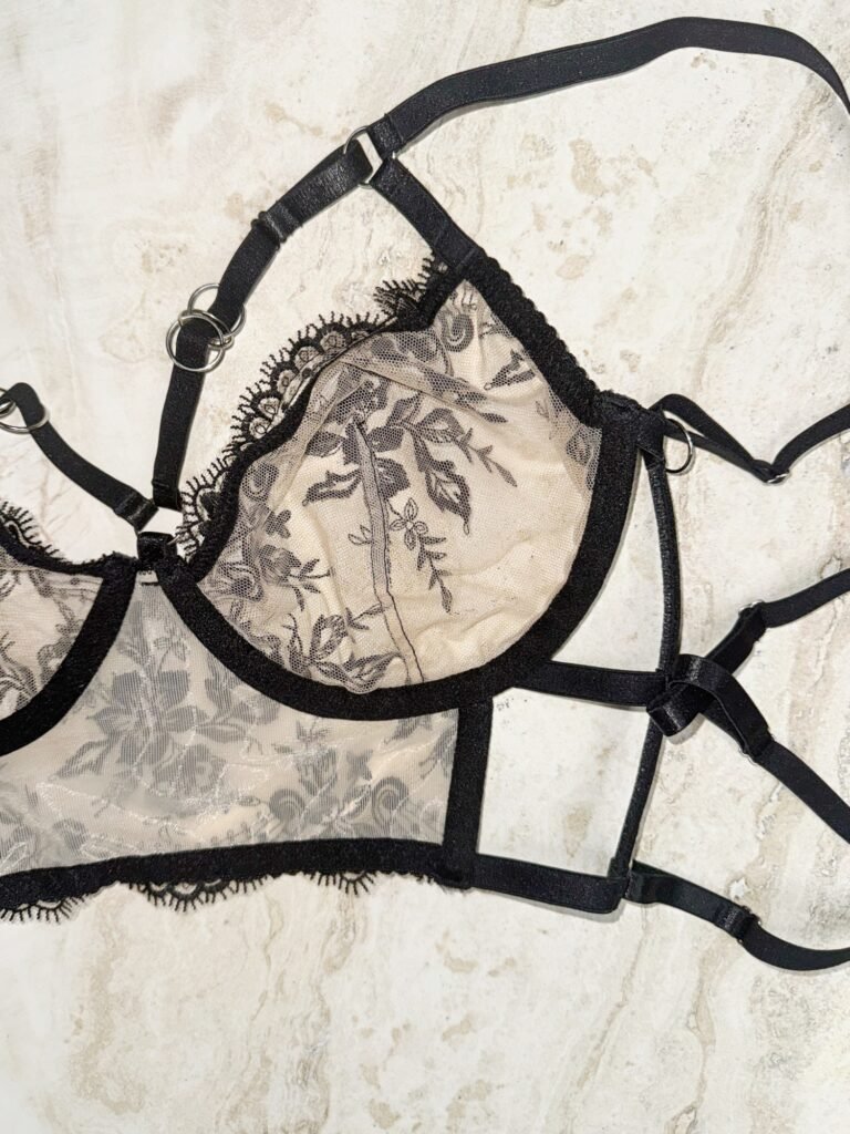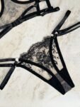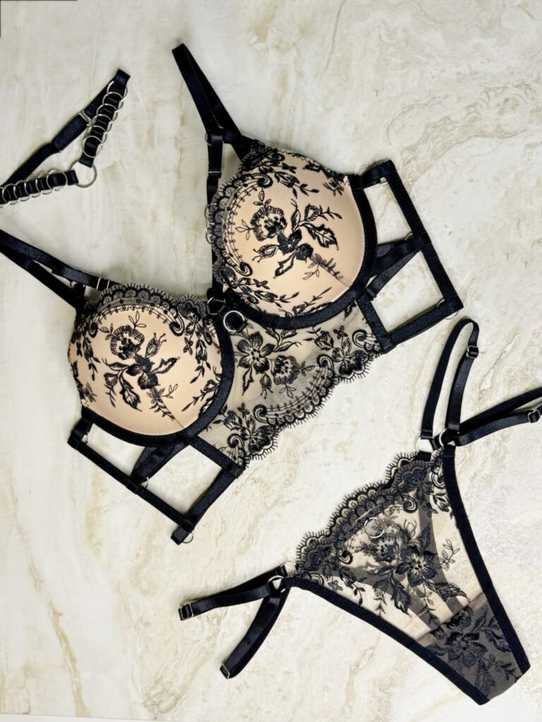 Elevate your lingerie collection with this stunning 4-piece set, which includes a choker, bra, belt, and panties, all designed in a seductive combination of black and nude tones. The bra, available in three variations (push-up, thin lining, and foam padding), showcases delicate floral lace embroidery, enhancing your curves beautifully. The thong-style panties are crafted with the same exquisite lace, featuring adjustable straps for a customized fit. The choker adds an edgy touch with its black strap and silver ring details, while the matching belt enhances the overall silhouette. Designed to empower and inspire confidence, this set combines intricate lacework, adjustable elements, and bold design for a striking look.