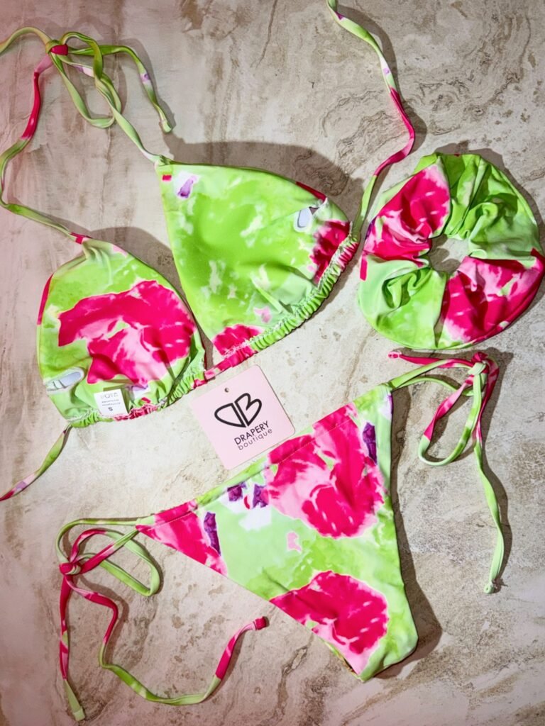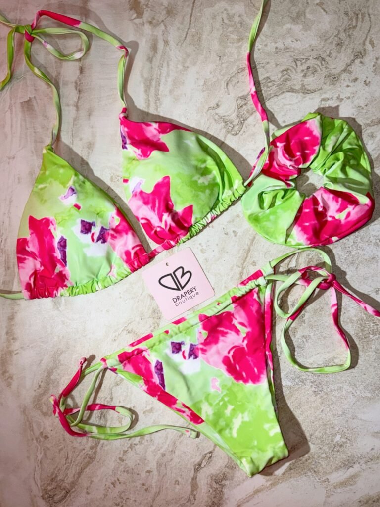 Embrace tropical vibes with this stunning floral bikini set. Designed with an eye-catching blend of neon pink and green floral patterns, this bikini is crafted from premium, quick-dry fabric to ensure comfort and durability. The triangle top and adjustable string-tie sides on the bottoms allow for a custom fit. Included is a matching scrunchie for a coordinated style. Make a bold statement at the beach or pool with this lively and colorful bikini set, perfect for the fashion-forward beach lover.