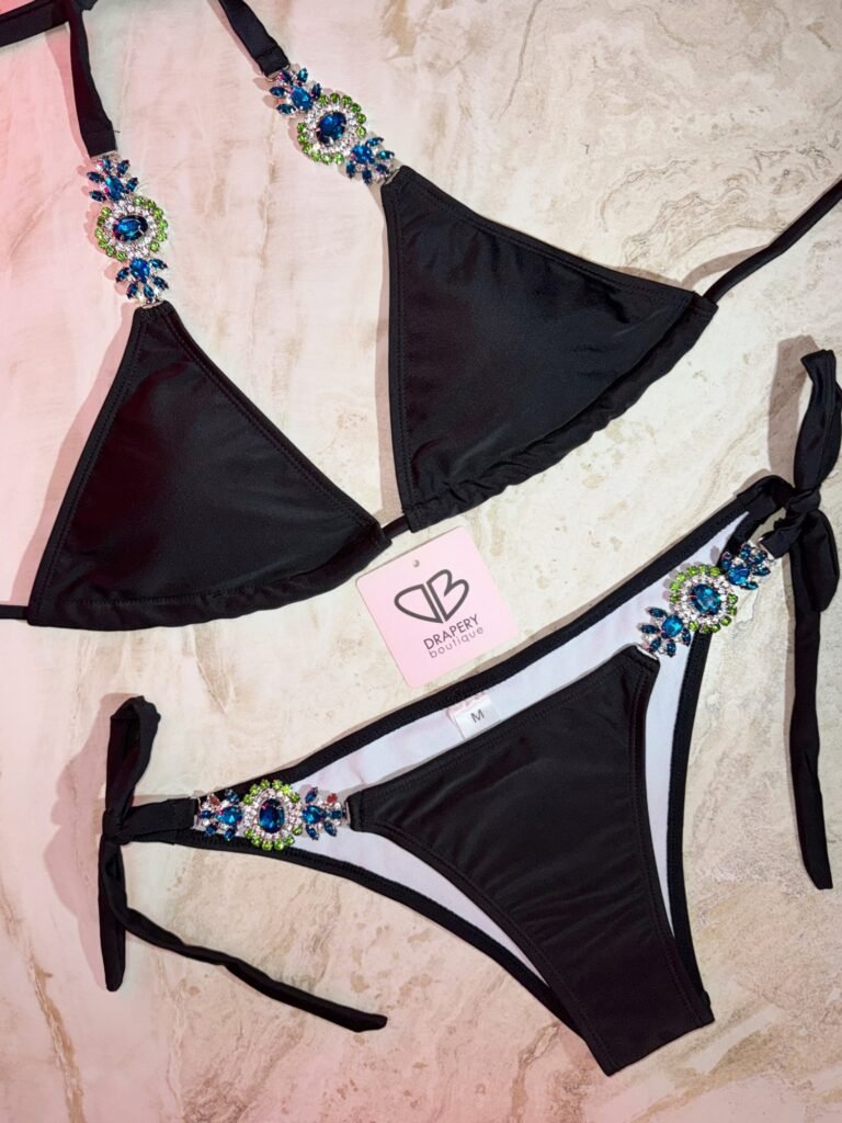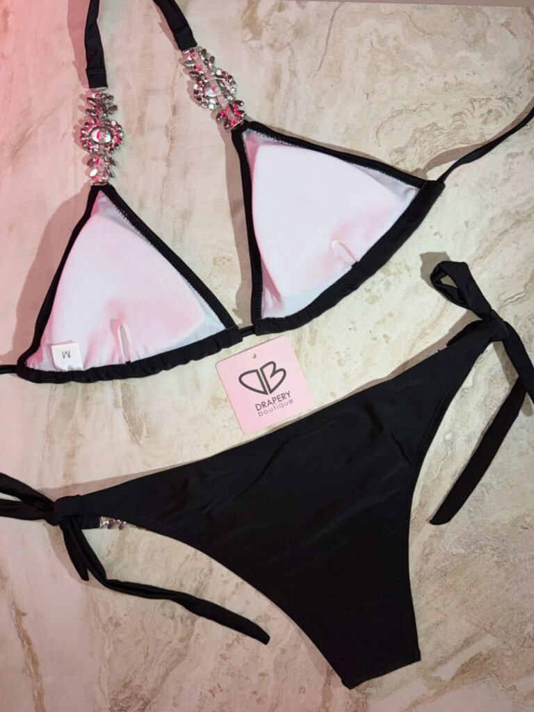 Turn heads on the beach in this stunning black bikini with elegant jeweled accents. Designed by Drapery Boutique, this set combines luxury with simplicity, perfect for making a sophisticated statement.