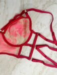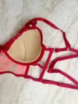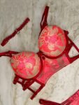 Step into the spotlight with this captivating 4-piece lingerie set in a show-stopping neon orange with striking red accents. The set includes a stylish choker adorned with silver rings, adding an edgy, yet elegant touch to your look. The bra offers options with push-up, thin lining, or foam padding for a custom fit and is crafted with vibrant floral embroidery in neon orange, standing out against a mesh backdrop with red straps and accents.