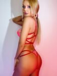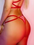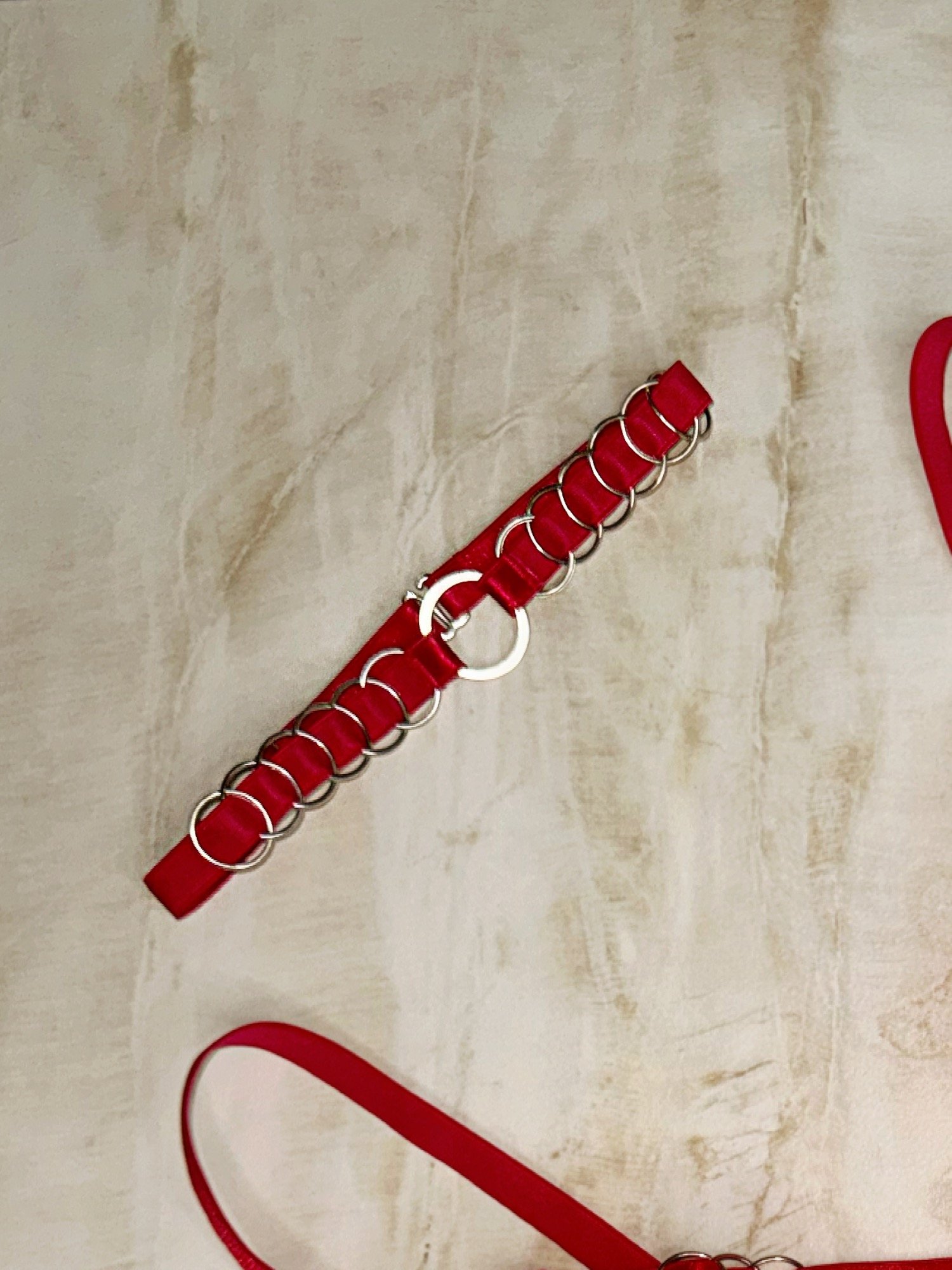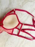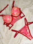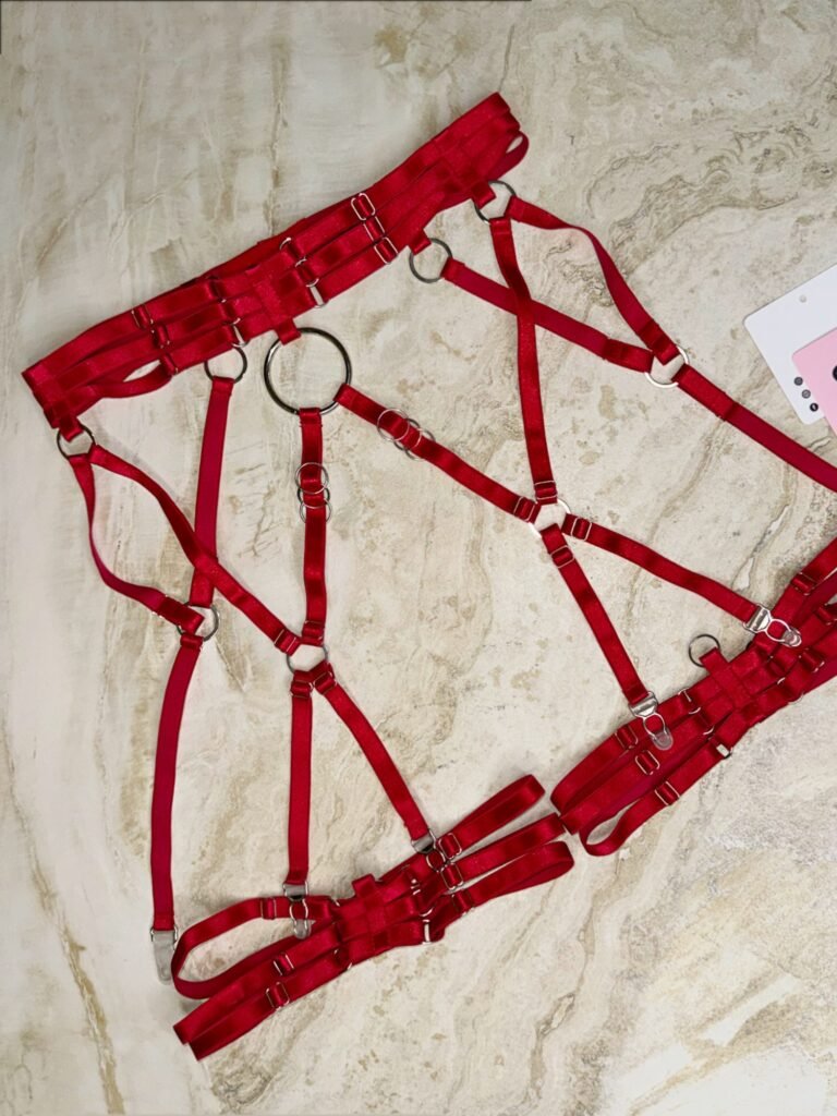 The high-waisted belt is intricately designed with multiple adjustable straps and silver O-rings, perfectly contouring the waist and framing the curves with seductive appeal. Completing the set are the thong-style panties, featuring the same neon floral embroidery on a sheer base, complemented by adjustable red straps to ensure a comfortable, flattering fit. Designed to make a lasting impression, this set combines elegance with a daring flair, ideal for those who love to stand out.