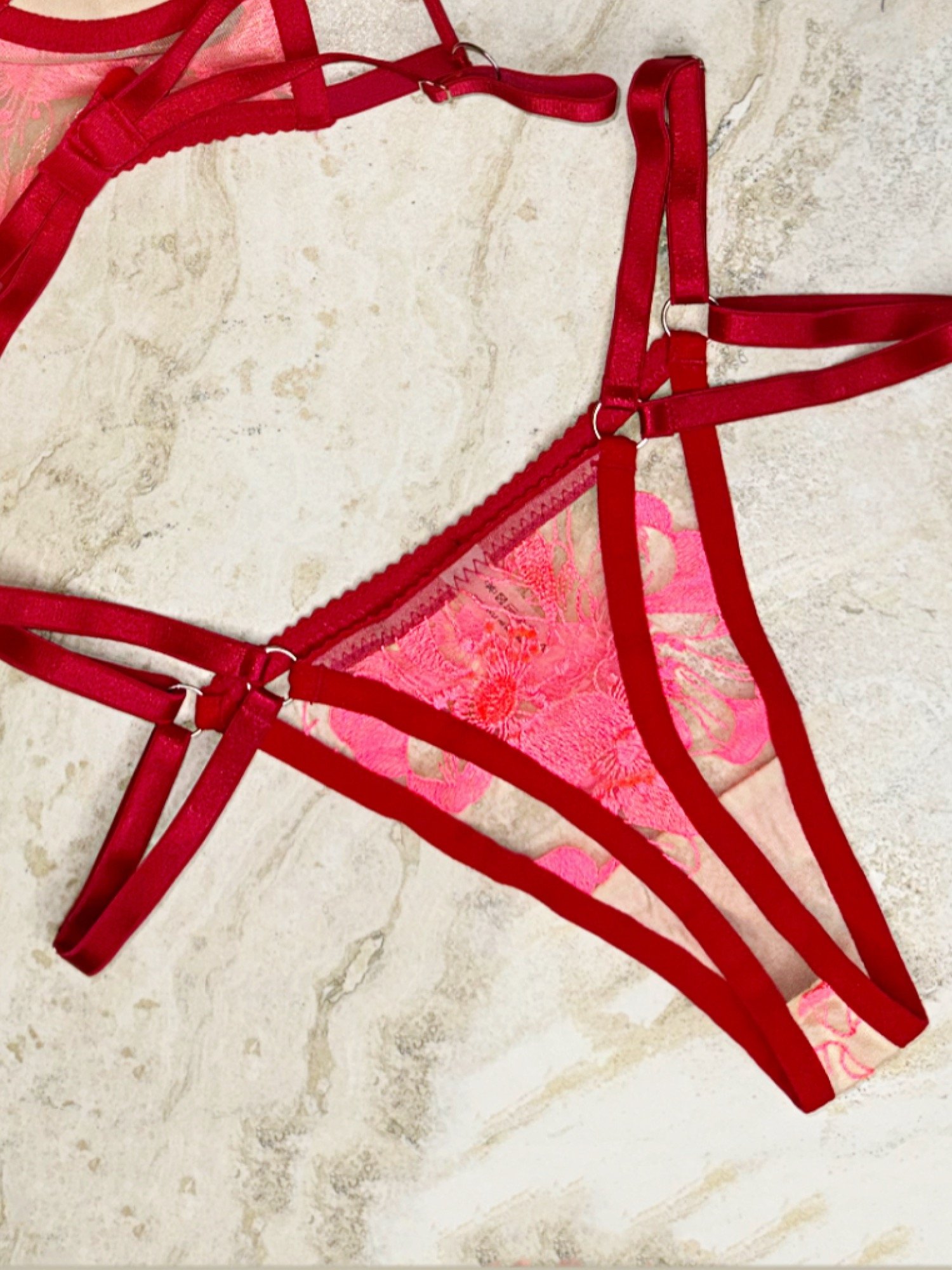 Infuse color and elegance into your lingerie drawer with these striking neon orange lace panties. Crafted in a seductive thong style, these panties feature vibrant floral embroidery on sheer mesh, creating a captivating contrast. The delicate lace is perfectly complemented by bold red straps that are both adjustable and stylish, ensuring a comfortable and secure fit. This eye-catching design combines vibrant neon lace with the passion of red accents, making these panties a must-have for those looking to add a pop of color and sophistication to their collection.