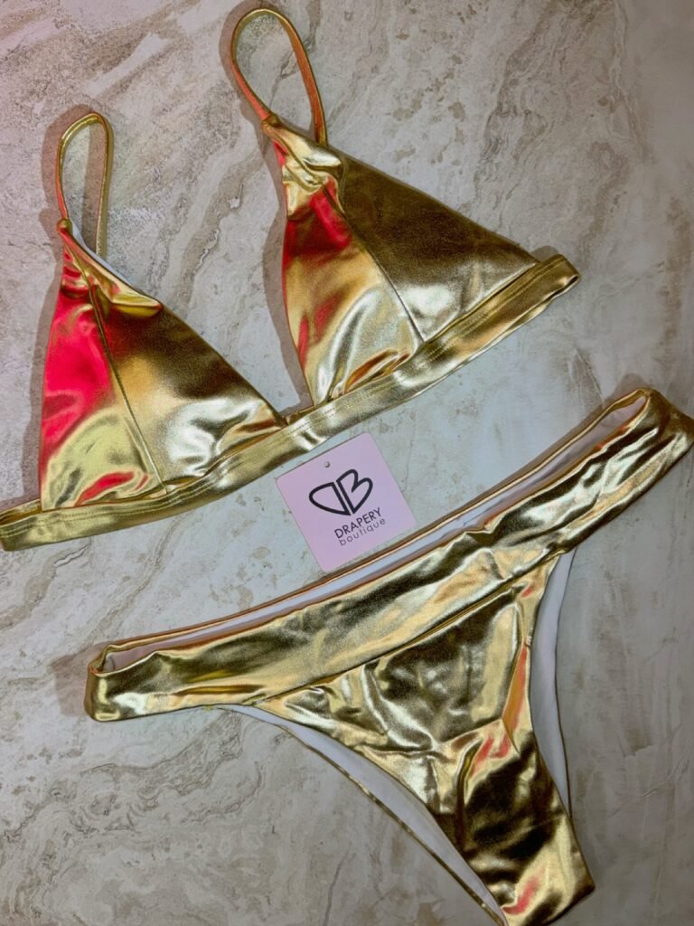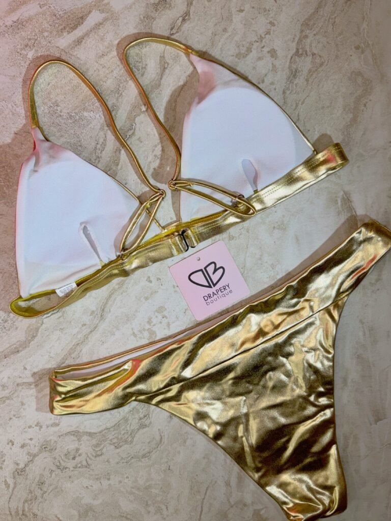 Shine like a goddess in this stunning gold metallic bikini set, perfect for turning heads at the beach or pool.