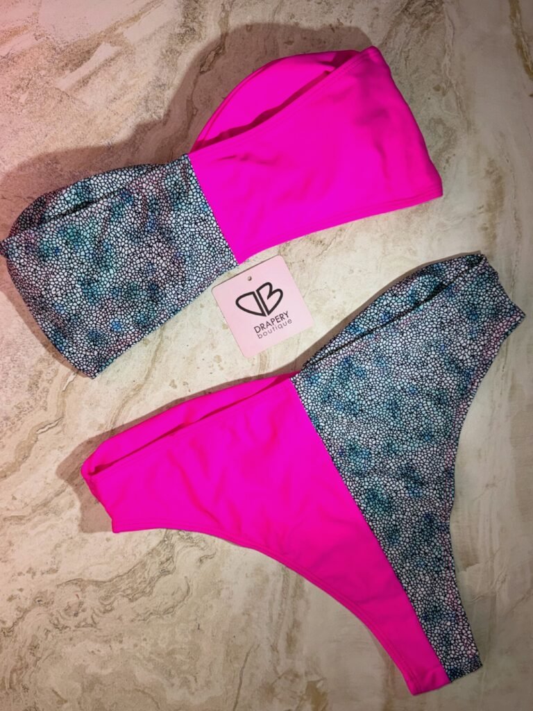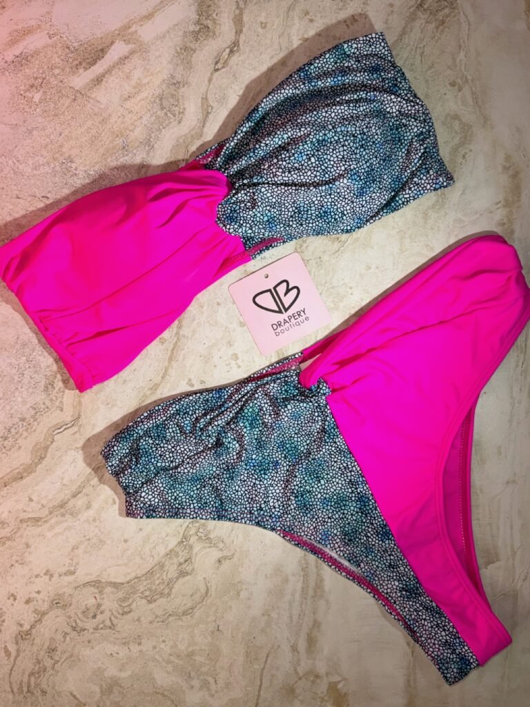 Make a bold statement with this bandeau-style bikini featuring vibrant pink and shimmering oceanic blue. Perfect for lounging by the pool or soaking up the sun in style.
