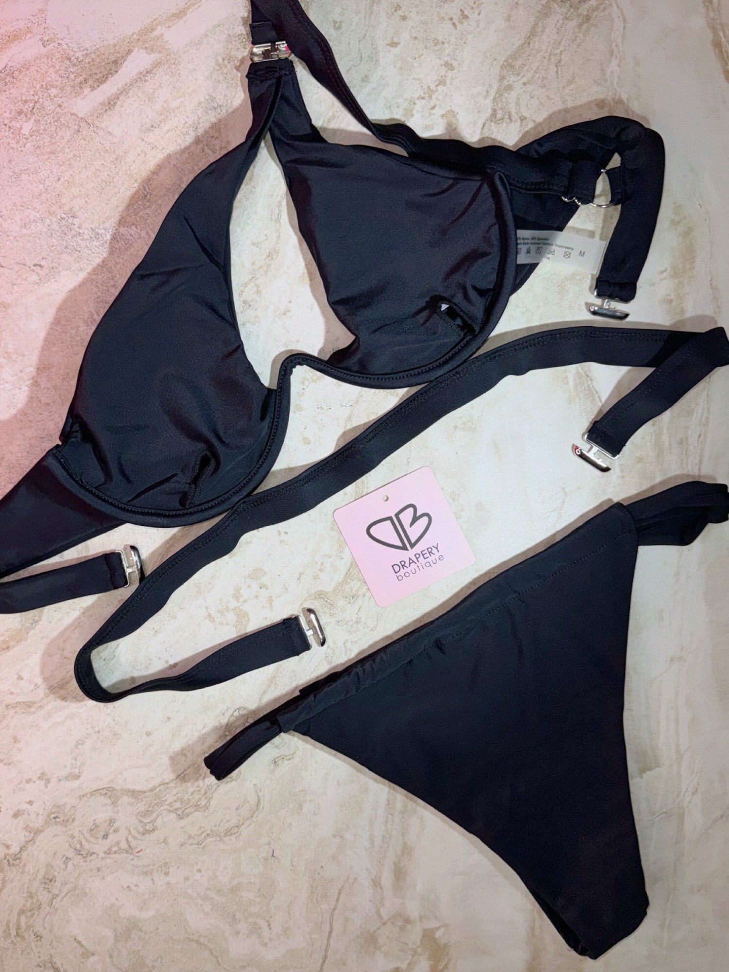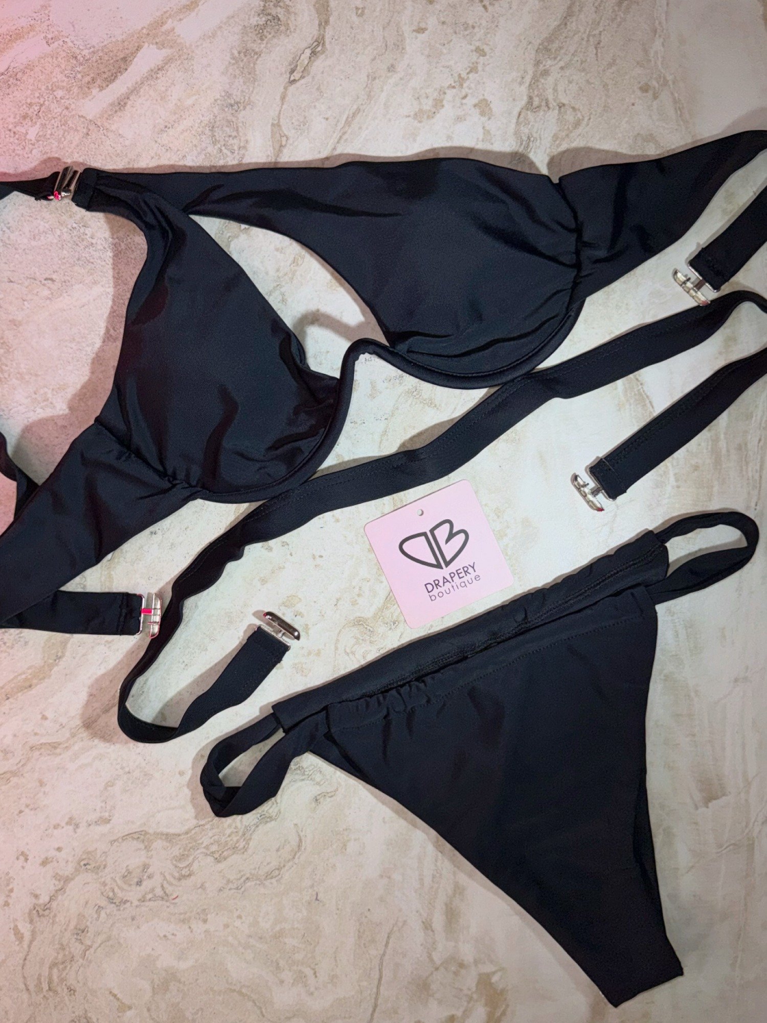 Crafted from high-quality, quick-drying fabric, this bikini feels as good as it looks. The bold black color enhances your sun-kissed glow and exudes timeless elegance, making it a versatile choice for any swim occasion. Whether lounging poolside or diving into the waves, this bikini is your ultimate summer staple.
