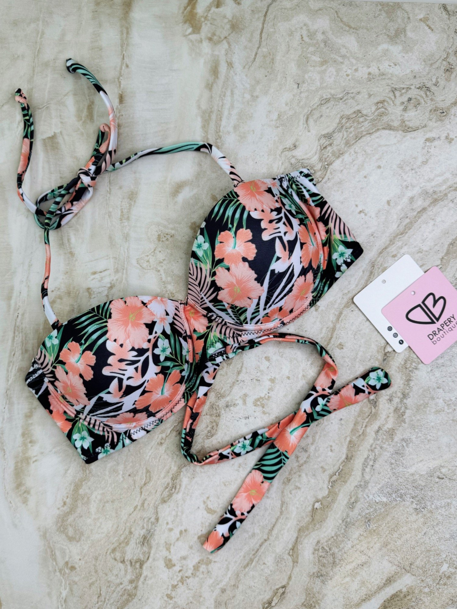 This floral bandeau bikini set features a vibrant pattern with a strapless, push-up top for extra support. Straps are removable , mid-rise bottoms offer comfort and versatility, perfect for both tanning and swimming.