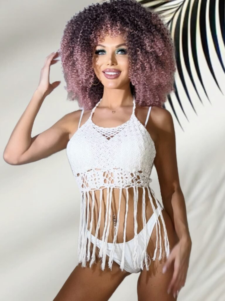 Elevate your beach look with this hand-crocheted white top, crafted with meticulous detail for a lightweight and breathable feel. Made from high-quality cotton, this top features an intricate crochet design that beautifully showcases floral and geometric patterns. The halter-style straps provide a comfortable and adjustable fit, while the long fringed hem adds a boho-chic flair, perfect for tropical getaways or poolside lounging. Wear it over your favorite bikini or pair it with shorts for a casual summer outfit. The crisp white color complements all skin tones and swimwear styles, making it a versatile and must-have piece for your beach wardrobe.