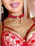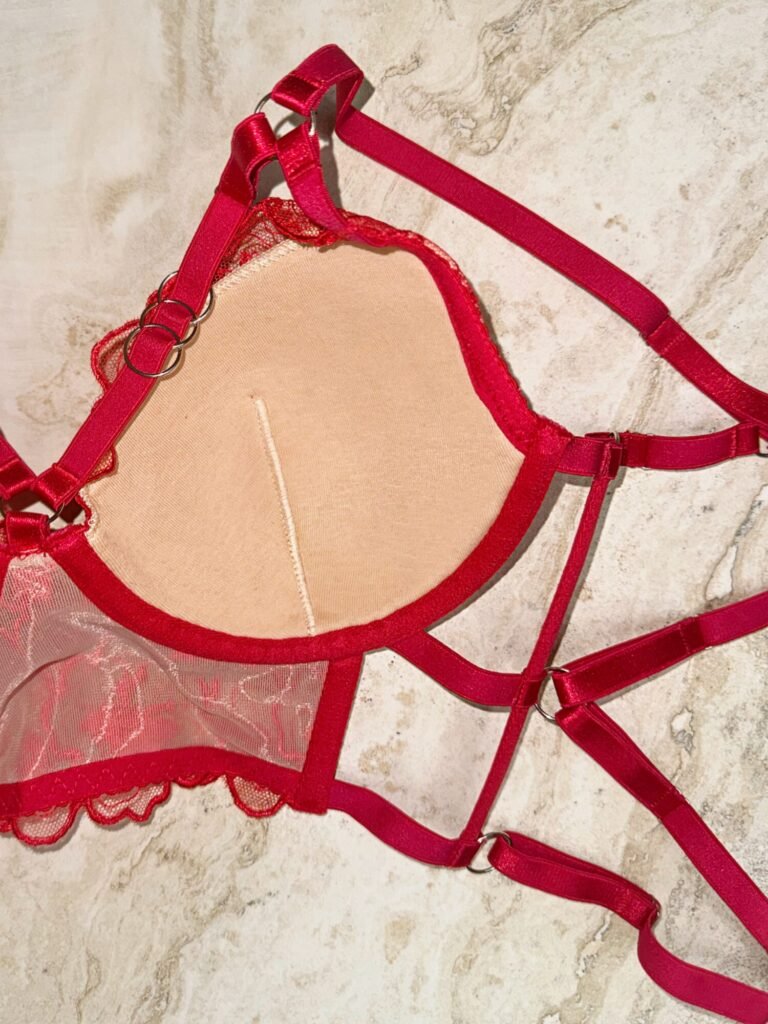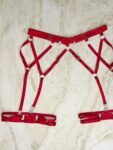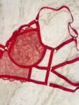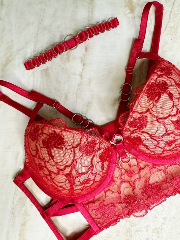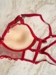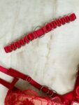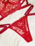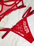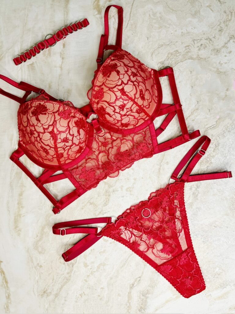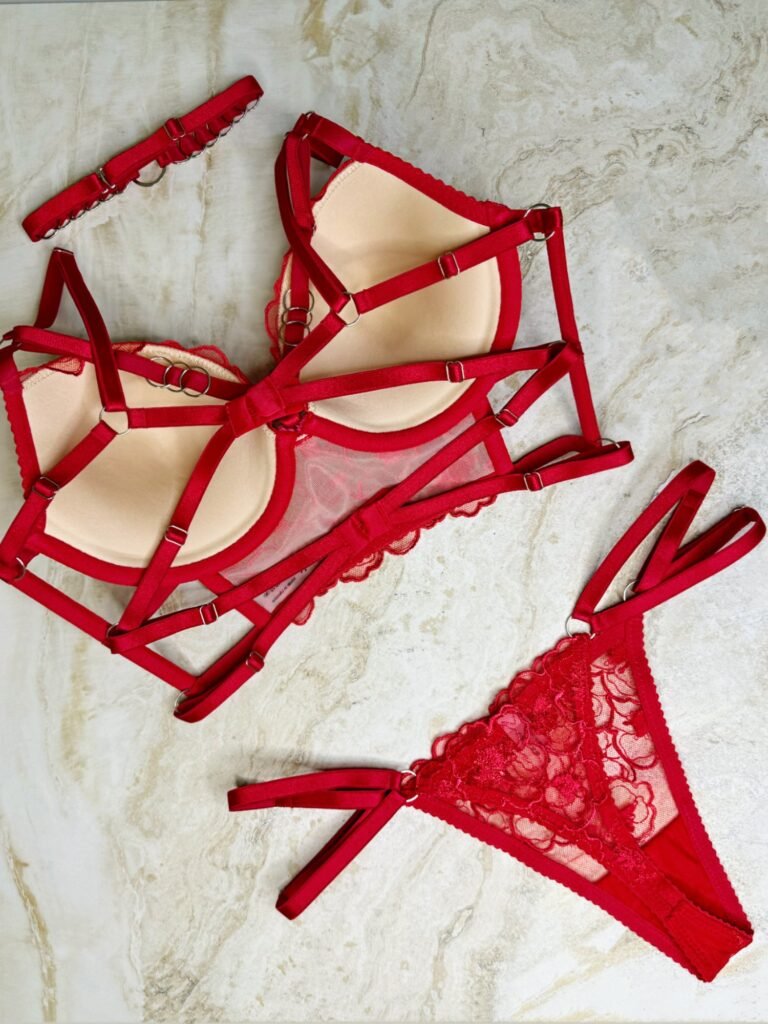 Unleash your inner confidence with this fiery red lingerie set, crafted for those who love a bold, unforgettable look. The set includes a choker, intricately designed bra, waist belt, and matching thong. The lace bra, available in push-up, thin lining, and thin foam padding, showcases beautiful floral patterns that accentuate your curves, while the strappy, adjustable back adds a hint of allure. The matching thong panty, adorned with lace detailing and accented by double side straps, provides both comfort and style, framing your figure perfectly. The waist belt, featuring a series of adjustable straps with metallic ring accents, completes the look with a daring edge. Ideal for special nights or whenever you want to feel your most empowered.