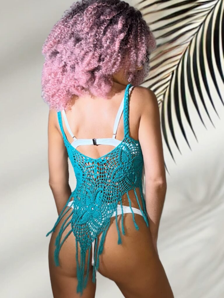 Add a touch of bohemian elegance to your beachwear with this teal crochet beach top. Perfect for layering over your favorite swimwear.