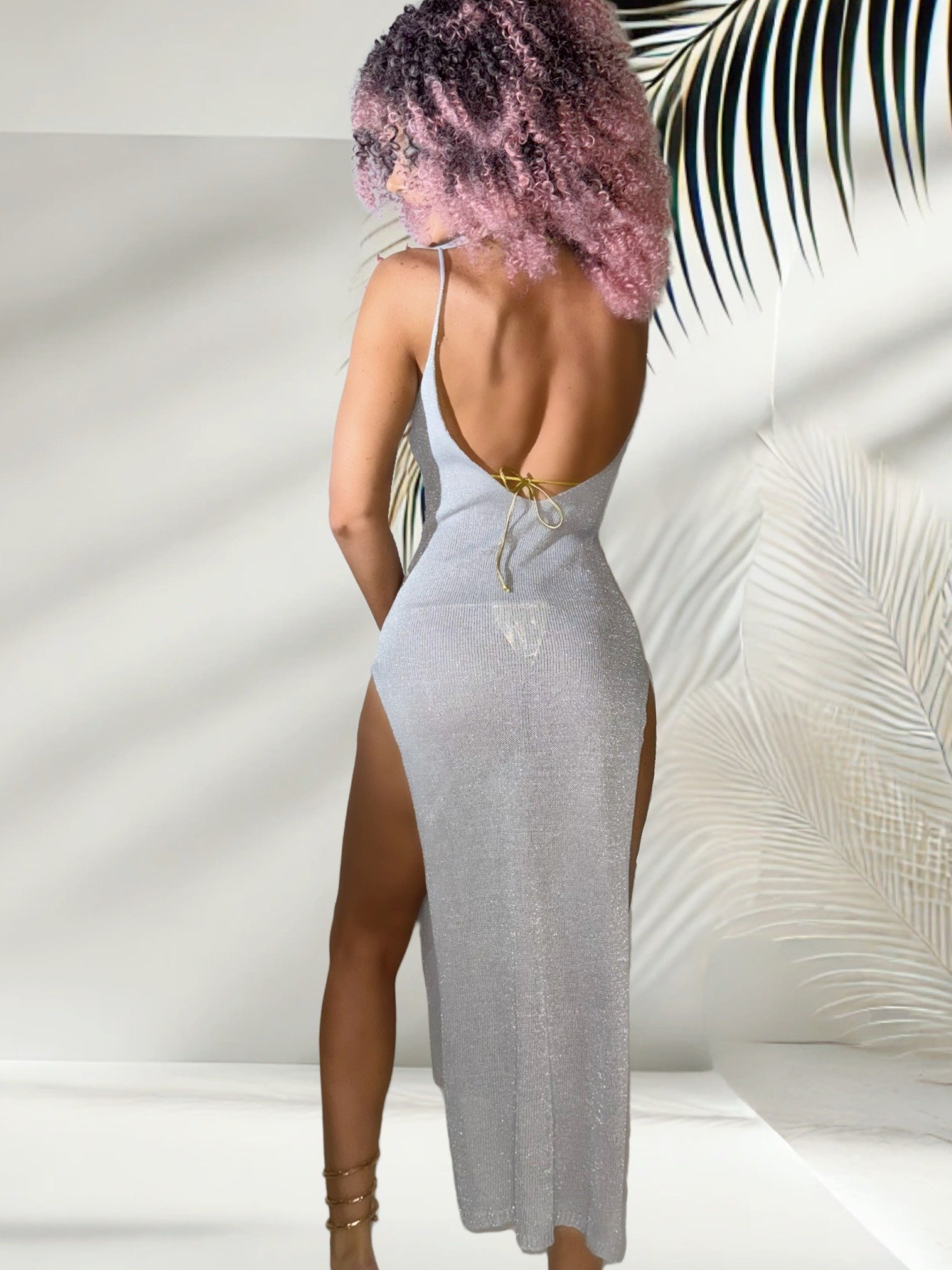 Elegant silver shimmer beach dress featuring a sleek design with adjustable straps and side slits. Perfect for adding a glamorous touch to your beach or poolside look.