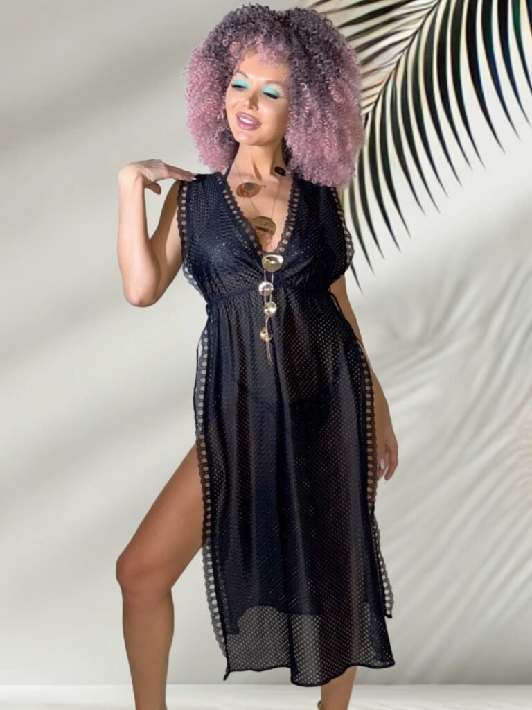 This black sheer beach dress is the epitome of beach glamour and effortless sophistication. Made from lightweight and breathable mesh fabric, it ensures comfort even on the hottest days. The sleeveless design with a flattering V-neckline complements all body types, while intricate crochet trim along the sides adds a touch of bohemian elegance. High side slits bring an alluring charm, allowing ease of movement and showcasing your swimsuit underneath. Whether you’re lounging by the pool or walking along the shore, this dress offers the perfect balance of coverage and allure. Ideal for pairing with your favorite bikini and sandals for a complete beach-ready look.
