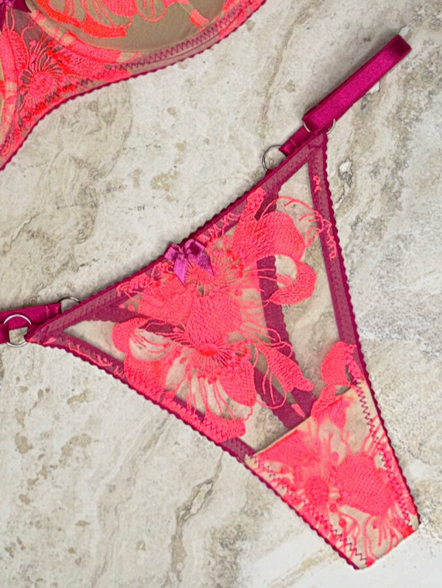 Add a touch of daring color to your lingerie collection with these exquisite thong-style panties. Featuring a captivating neon orange lace that delicately overlays a sheer base, these panties are framed by bold pink straps for a striking contrast. The floral lace pattern brings a playful charm, while the soft, stretchable fabric ensures a comfortable, flattering fit.