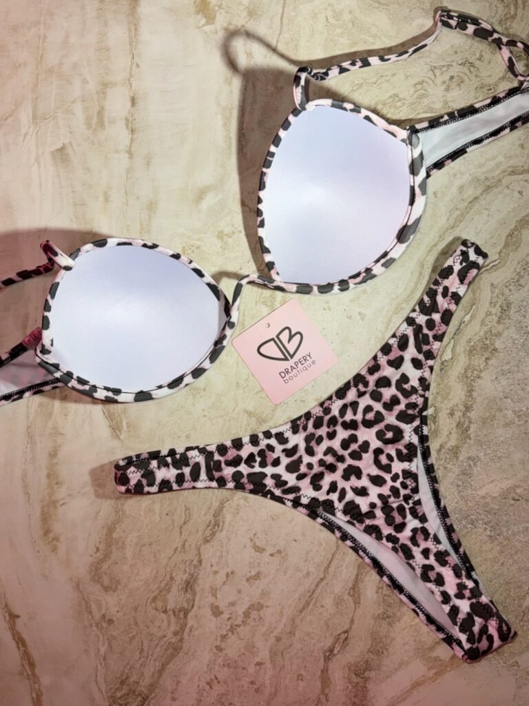 Fierce and fabulous, this leopard print bikini set is designed to turn heads. Featuring an underwired top and high-cut bottoms, it’s the perfect combination of support and style.